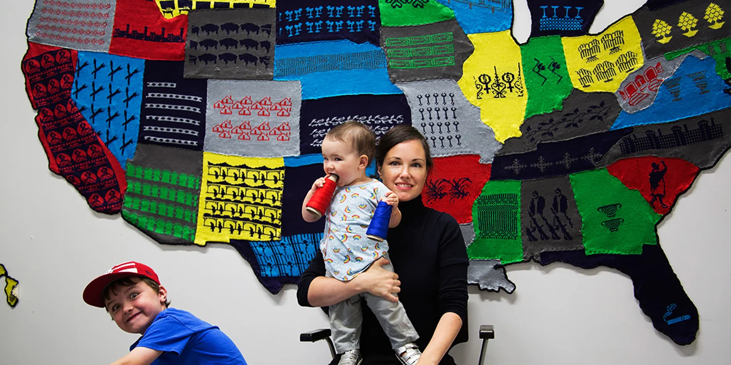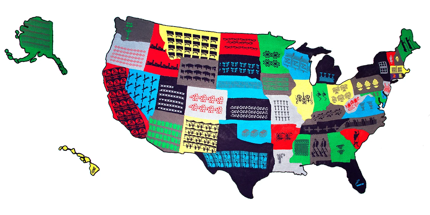 Cat Mazza is a Brooklyn-based activist and textile artist whose work combines digital media and traditional crafts to explore the intersection of textiles, technology, and labor. Inspired by Hillary Clinton’s historic nomination for president, Mazza created a floor-to-ceiling knitted map showcasing the lineage of women’s labor and celebrating the generations of women who have fought for equality. The piece was crafted from needlework, a historically feminized form of industrial labor, and symbols from historic moments in the labor movement are stitched on each state.