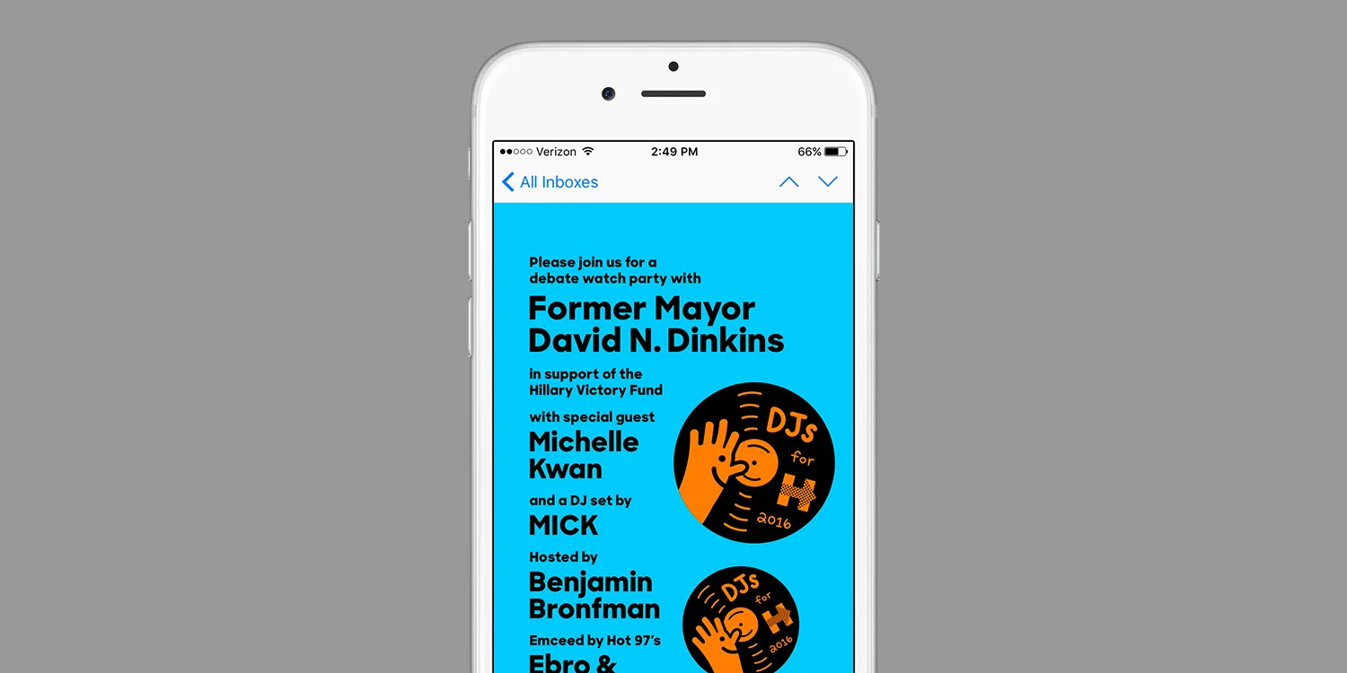 Over the course of the campaign, numerous DJs volunteered to provide music at official events. We worked with designer Matthew Jacobson and illustrator Jason Sturgill to produce “DJs for Hillary” stickers that were distributed at a presidential debate watch party and fundraiser in New York City. We incorporated the sticker design onto the email invitation that we designed for the watch party.