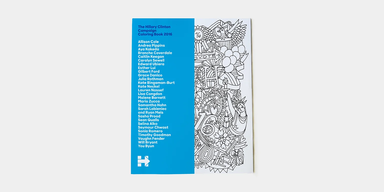 We invited over two dozen artists across the country to contribute illustrations to an official campaign coloring book; it was made available to Hillary supporters of all ages through our merchandise shop. We also converted many of the illustrations into digital graphics that were shared across social media.