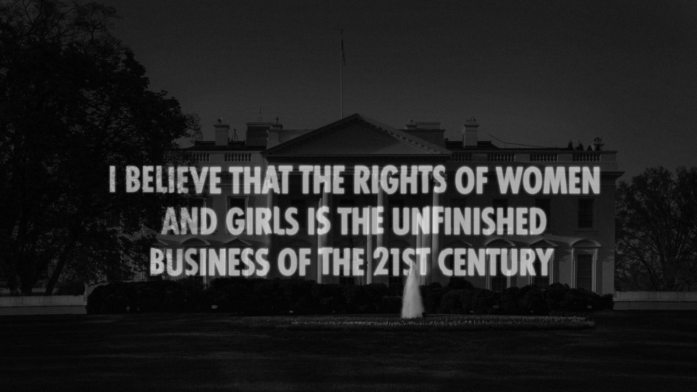 Jenny Holzer is a New York-based artist who uses text across a variety of media to question and convey ideas relating to feminism, hierarchy, oppression, and power. Her video piece celebrated Hillary Clinton’s decades-long work to advance the rights of women and girls across the world. Passages from past speeches were cast across the White House as a testament to Hillary’s work—and the milestone her presidency would have represented for gender equality.