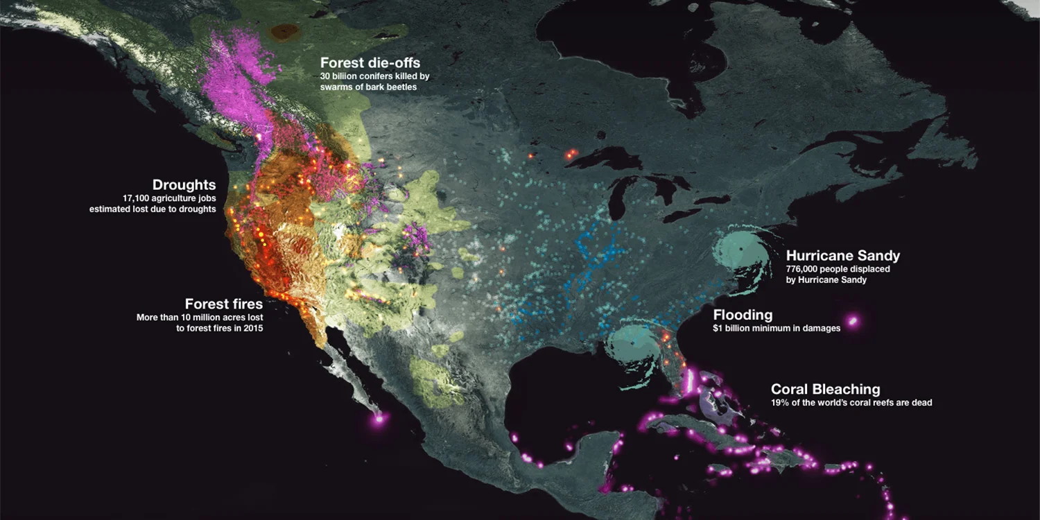 Maya Lin is the designer behind some of the best-known architectural and land art displays of the 20th century, including the Vietnam Veterans Memorial. Her piece sought to highlight the urgent threat of climate change, mapping the impact of extreme weather events and natural disasters that are growing more frequent and intense each year. As Hillary put it, “climate change isn’t some abstract future threat—it threatens our families and economy right now.” (Data sources include the U.S. Department of Defense, NASA, the General Bathymetric Chart of the Oceans, the World Resources Institute, and the National Oceanic and Atmospheric Administration.)