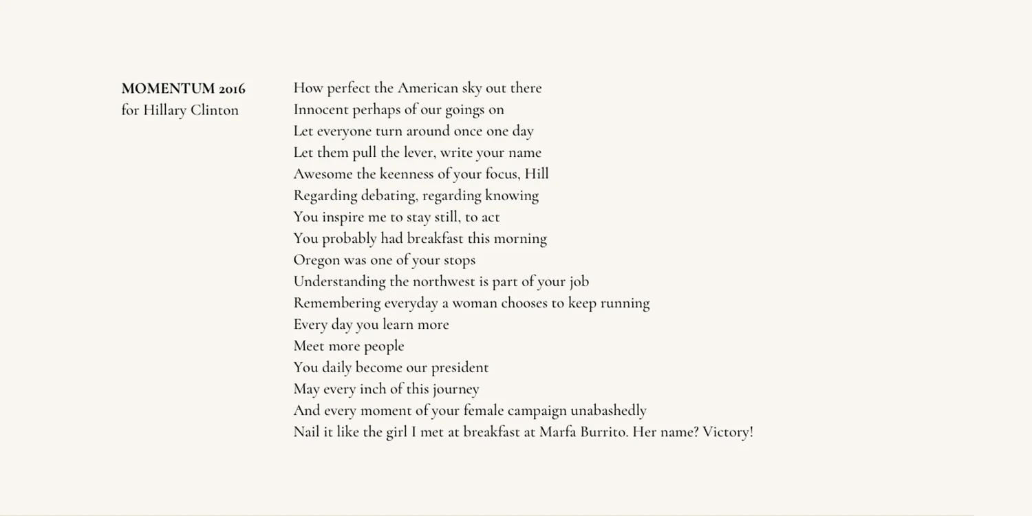 Eileen Myles is a poet who lives in New York and Marfa, Texas. She wrote and recorded “MOMENTUM 2016” in support of Hillary Clinton and to honor the historic nature of her candidacy.
